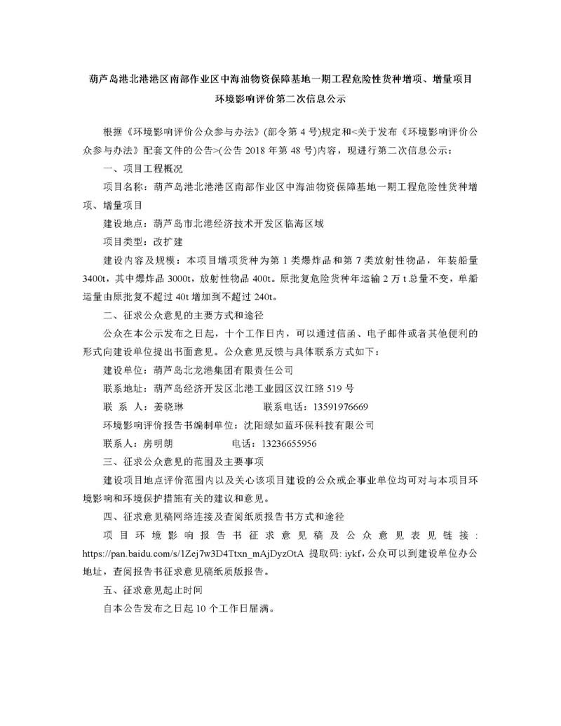 葫蘆島港北港港區(qū)南部作業(yè)區(qū)中海油物資保障基地一期工程危險性貨種增項、增量項目 環(huán)境影響評價第二次信息公示