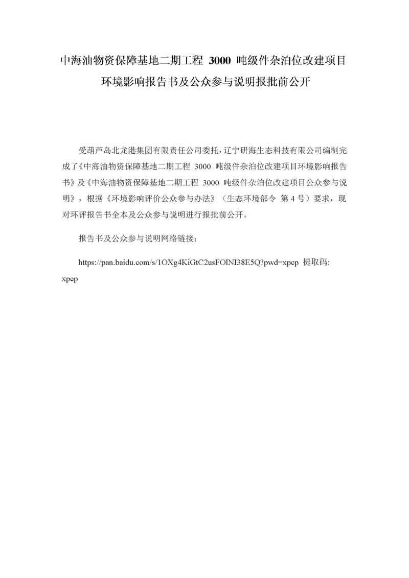 中海油物資保障基地二期工程 3000 噸級件雜泊位改建項目環(huán)境影響報告書及公眾參與說明報批前公開