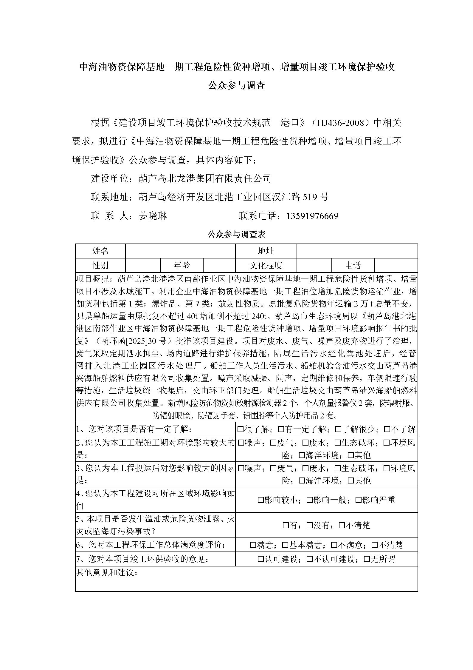 中海油物資保障基地一期工程危險性貨種增項、增量項目竣工環(huán)境保護驗收 公眾參與調(diào)查